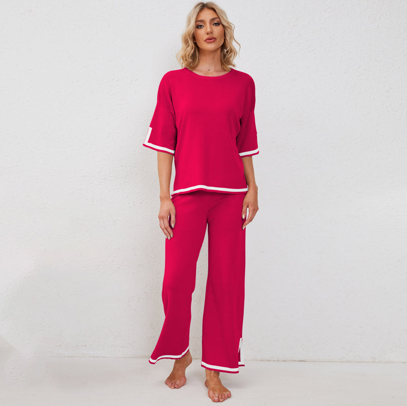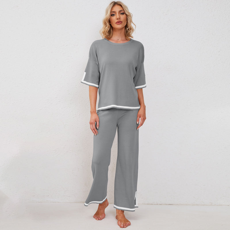 It features a crew neck, long/short sleeve, side split hem, and wide leg pants with elastic waistband, loose fit that fits any body size.