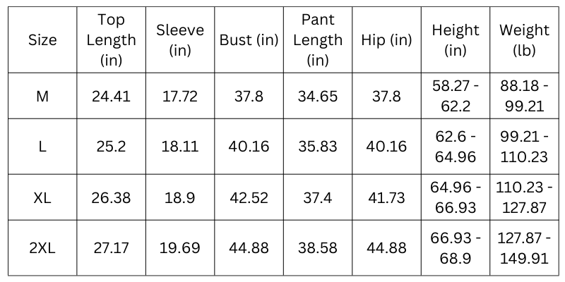 - Sleeve and Pant Length: Full-length sleeves with ankle-length pants for complete coverage