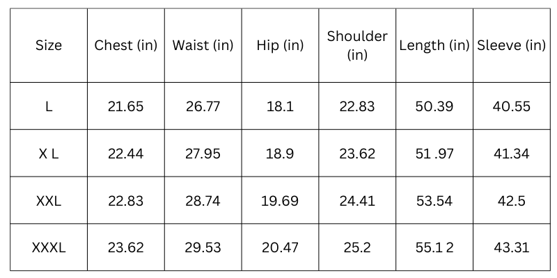 Size Chart (Inches):