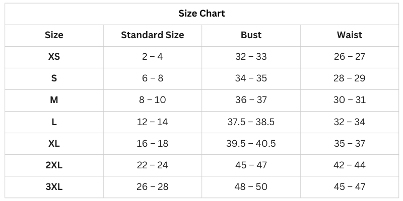 Size Chart (inches):